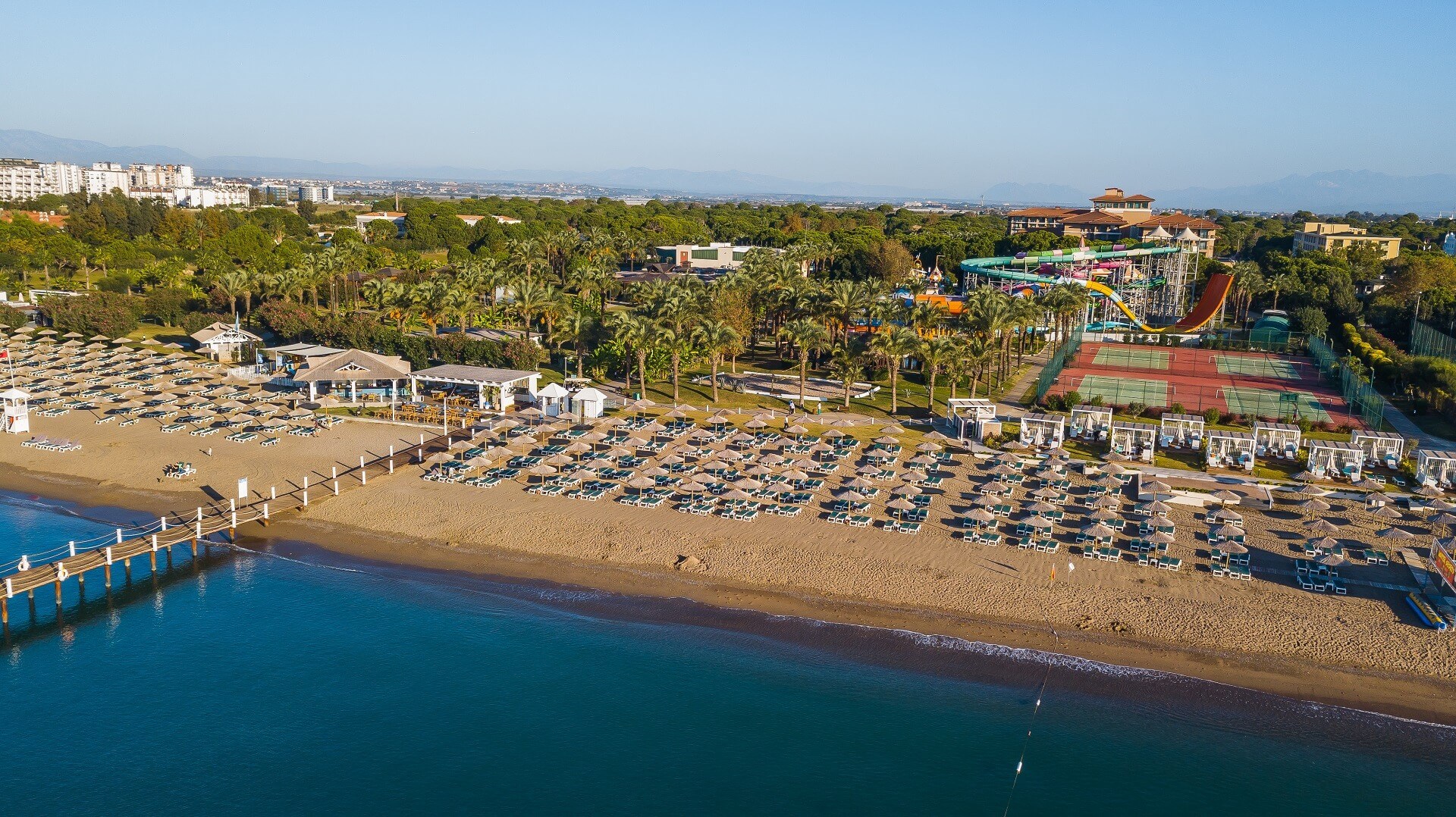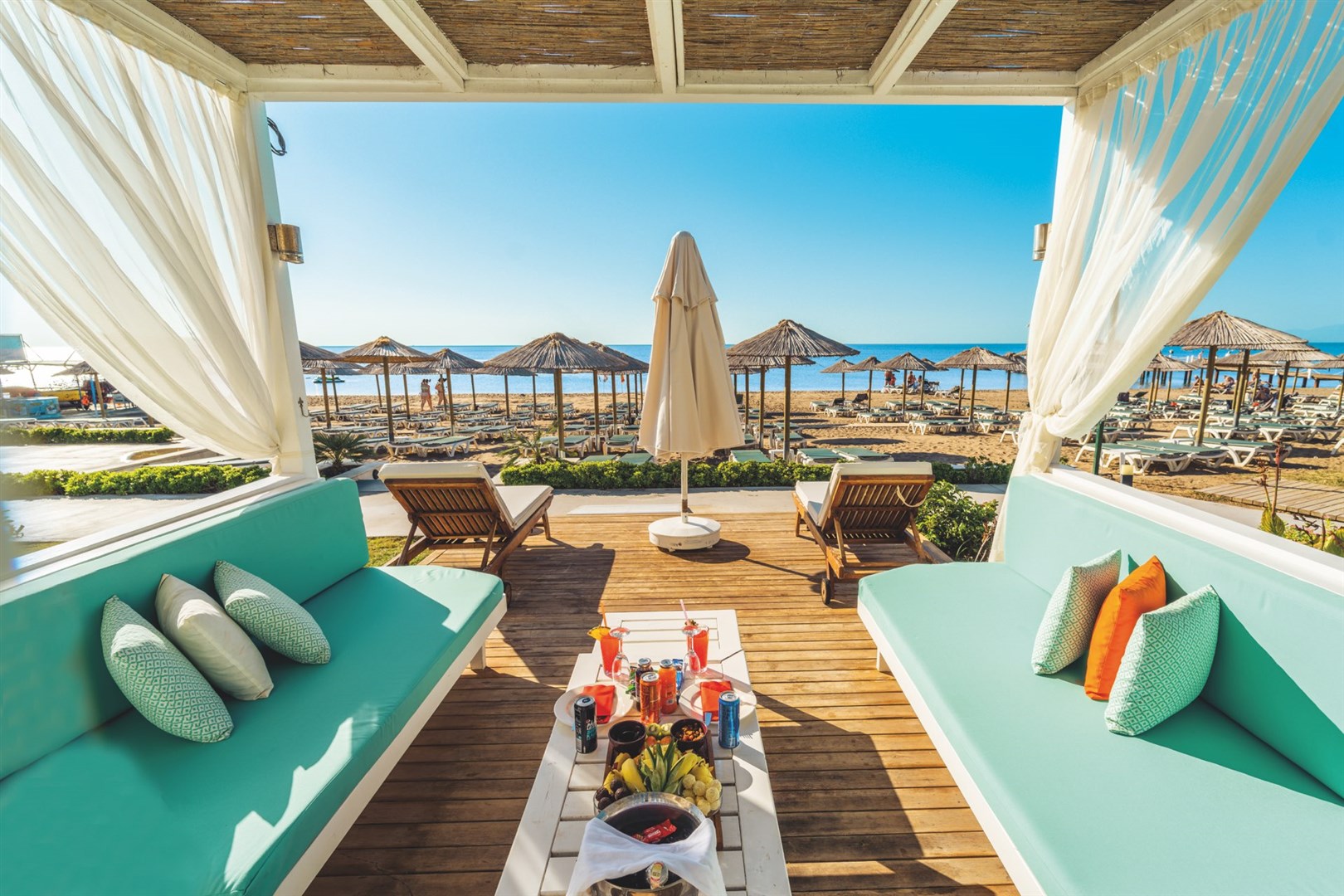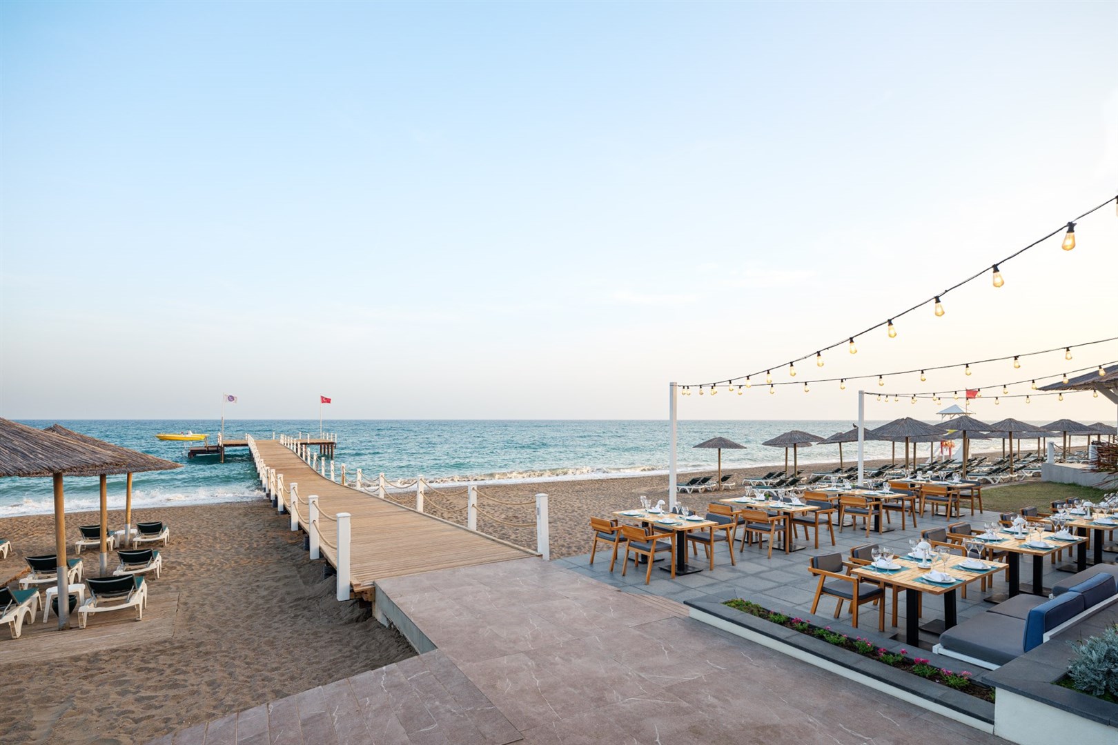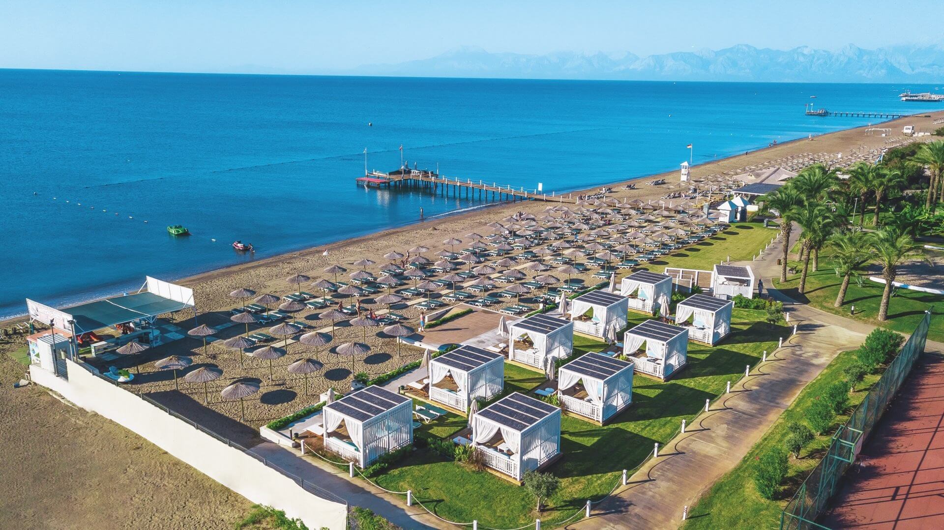 pečlivě udržovaná hotelová písečná pláž s pozvolným vstupem do moře oceněna Modrou vlajkou • hotelové plážové molo • slunečníky, lehátka, matrace a plážové osušky (zdarma) • možnost využívat bohaté služby hotelového all inclusive baru přímo u pláže