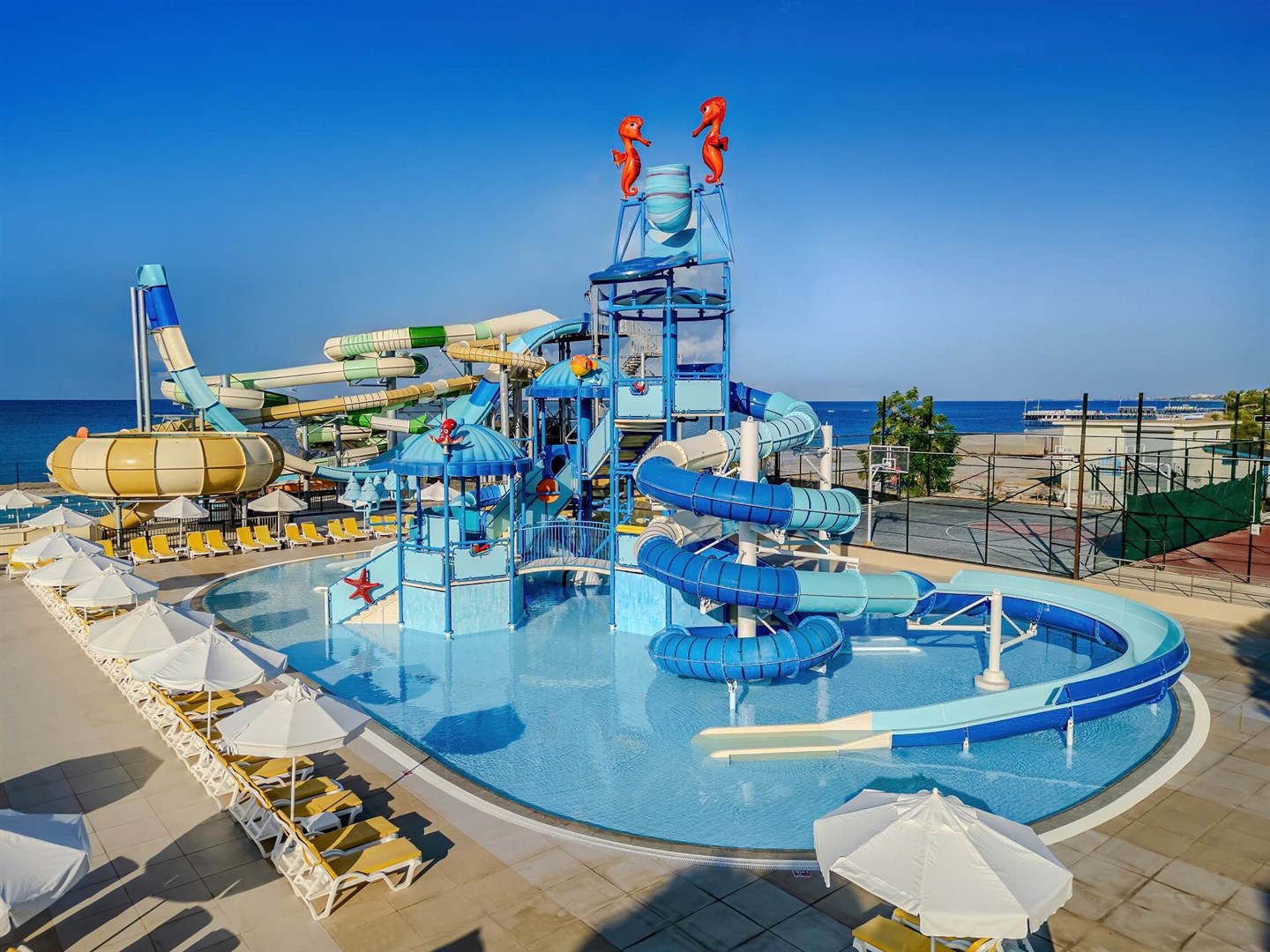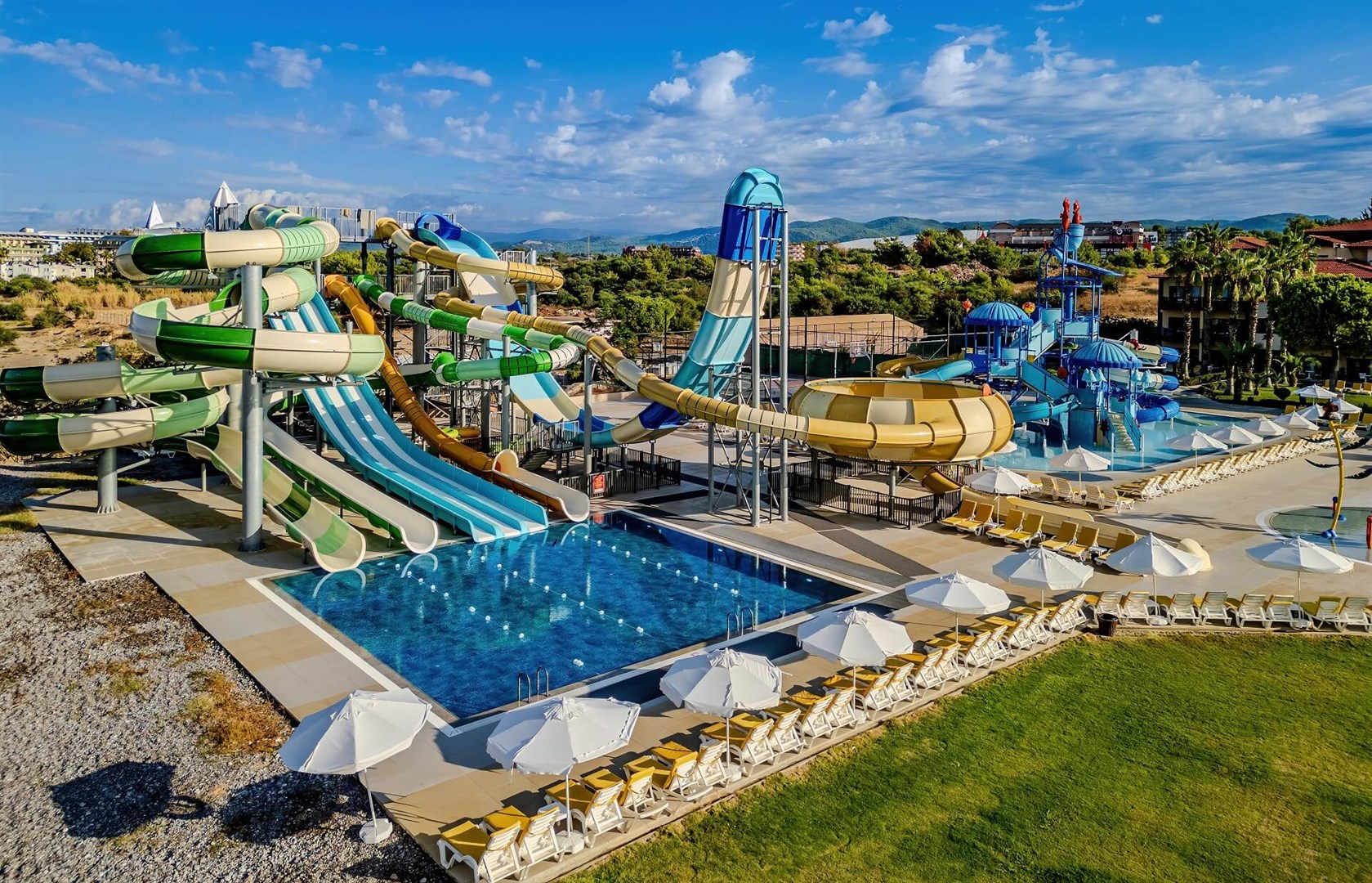 hlavní hotelová budova a 3-podlažní vilky • vstupní hala s recepcí • hlavní hotelová restaurace s venkovním posezením • 3 a‘la carte restaurace • 4 bary • diskotéka • cukrárna • dva venkovní bazény (jeden s tobogány) • dětský bazén • vnitřní bazén • turecké lázně (masáže za poplatek) • dětský miniklub • dětské hřiště • wifi v prostorách lobby (zdarma)